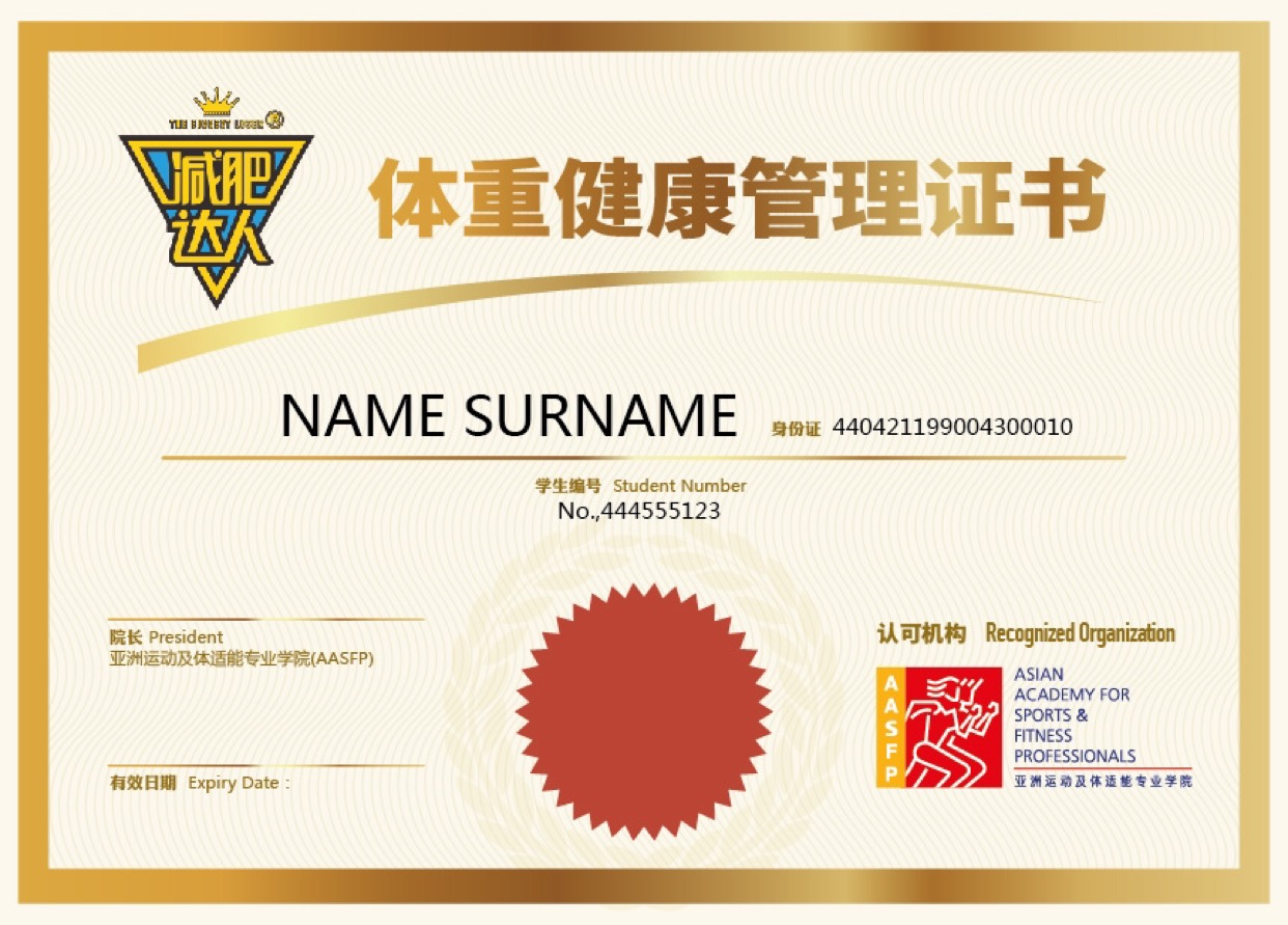 課程結(jié)束后,考試結(jié)業(yè)者可獲取由AASFP亞洲運動及體適能專業(yè)學(xué)院頒發(fā)的健康體重管理認(rèn)證資格證書,終身資格認(rèn)證,亞體官網(wǎng)可查??梢詽M足加入減肥達(dá)人訓(xùn)練營的營員一邊減肥一邊學(xué)習(xí)體重管理師課程,減肥營期結(jié)束后經(jīng)考核可獲得體重管理師資格,一次減肥終身控重,實現(xiàn)讓初學(xué)者從零起步到瘦身專家轉(zhuǎn)變。減肥達(dá)人訓(xùn)練營也是全國首先針對減重學(xué)員開展體重管理師培訓(xùn)的運動減肥機構(gòu)。