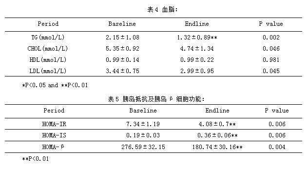 血液生化指標(biāo):TG(P<0.05)、膽固醇(P<0.05)顯著降低(表4);HOMA-IR(P<0.01)、HOMA-IS(P<0.01)和HOMA-β(P<0.01)指標(biāo)有明顯的有利改變(表5)。