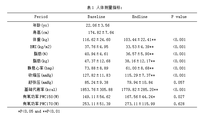 1.人體測(cè)量:體重、體脂百分比、安靜心率、收縮壓等基本生理指標(biāo)顯著下降,心肺功能顯著上升(表1)。