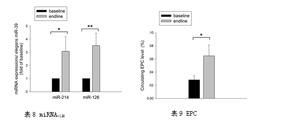 -214(P<0.05)、EPC數(shù)量(P<0.01)(表9)和EPC功能(P<0.05)顯著升高。