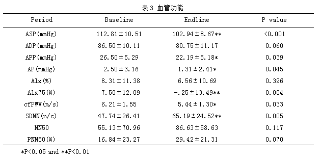 3.血管功能:中心動(dòng)脈壓CAP(P<0.01)、心臟負(fù)荷指數(shù)AIx(P<0.05)、頸股動(dòng)脈脈搏波傳導(dǎo)速度cfPWV(P<0.05)顯著下降;心率變異性指標(biāo)SDNN(P<0.01)顯著性升高(表3)。