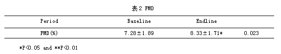 2.血管內(nèi)皮功能:內(nèi)皮依賴(lài)性血管介導(dǎo)的血管舒張功能FMD顯著增高(P<0.05)(表2)。